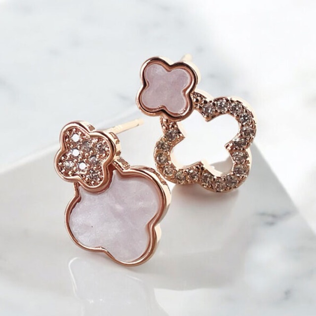 アシンメトリーのクローバーデザインが愛らしく可憐な印象を与えてくれる魅力溢れるデザイン、Shell Asymmetry Clover ピアス/イヤリング【ニッケルフリー】 ネックレスとセットで着用していただくのもおすすめ♡ 上品でありながら個性的なデザインが特徴的です。軽やかなシェル素材を使用し、美しいピンクゴールドメッキに、キュービックジルコニアストーンをあしらったアクセサリー♡デイリーからお呼ばれコーデまで幅広く着用でき、シーズンレスで楽しめます♡ショートサイズでつけ心地も抜群♡ニッケルフリーの素材を採用しているため、敏感肌の方にも安心してご使用いただけます。 ■ 素材 ・素材: シェル、キュービックジルコニアストーン、真鍮(ニッケルフリー) ・ピアスポスト:Silver925 ・イヤリング:真鍮(ニッケル不使用) ※ネジで微調整ができるバネ式のイヤリングです。 ■ お手入れ/取り扱い注意事項 ・金属アレルギーの方にも安心して使用できる素材を使用していますが、全ての方にアレルギーが起きないことを保障するものではありません。 ・直射日光や高温多湿を避けて保管してください。 ・商品は1点1点、デザイナーが手作業で作っているので、商品の大きさ・長さ・カラーなど、生産の過程で、若干の個体差が生じる場合があります。 ■ 発送・注文に関する情報や注意事項 ・定休日を除く、12時までの注文で当日出荷(東京都から出荷)となります。 ■ その他の情報や注意事項 ・ピアス・イヤリングどちらでも選択可能です。 ・プレゼント用のギフトラッピングも対応しており、大切な方への贈り物にも最適です。 お問い合わせはショップのお問い合わせからお気軽にお寄せください。あなたのスタイルに合わせた特別なアイテムをお楽しみください。