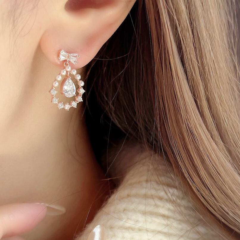 パールやキュービックジルコニアストーンの煌めきが美しく、プリンセス感も感じられるアイテム♡ラウンドのくり抜きに、キュービックジルコニアストーンの煌めき♡つけ心地は軽くデートシーンにもおすすめ♡♡ニッケルフリーの素材を採用しているため、敏感肌の方にも安心してご使用いただけます。